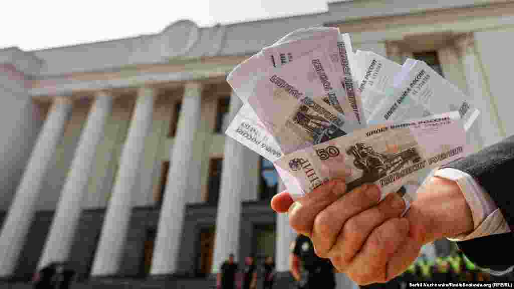 «На знак протесту проти найбільшого з часів Януковича наступу влади на мову ми принесемо депутатам-зрадникам 150 тисяч російських рублів», – анонсували напередодні організатори акції