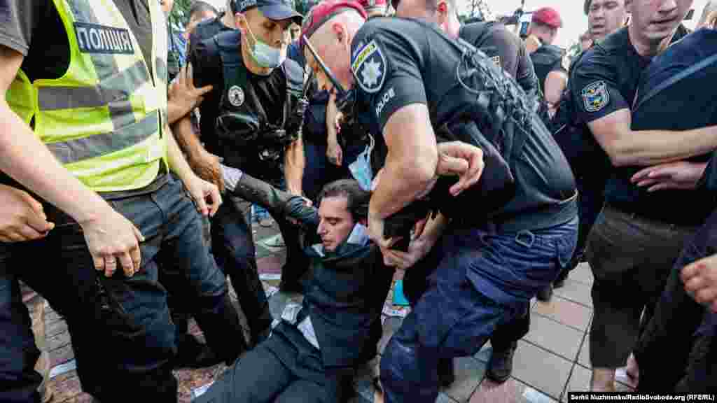 Його скрутили і відтягли за паркан.У затриманні активіста брав участь, зокрема, полк поліції особливого призначення (ПОП), який є правонаступником спецпідрозділу «Беркут». Загалом були силовики з кількох силових структур, серед них особи в цивільному, які безпосередньо брали участь у затриманні активіста