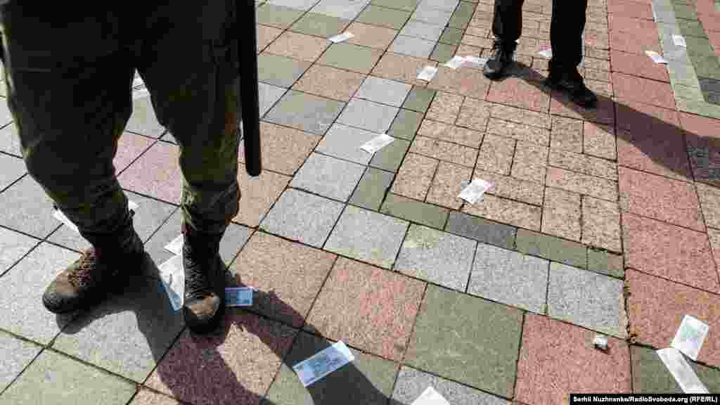 По закінченню акції правоохоронці намагалися скласти адмінпротокол про порушення благоустрою щодо активіста, який тримав кейс і розкидував «російські рублі»