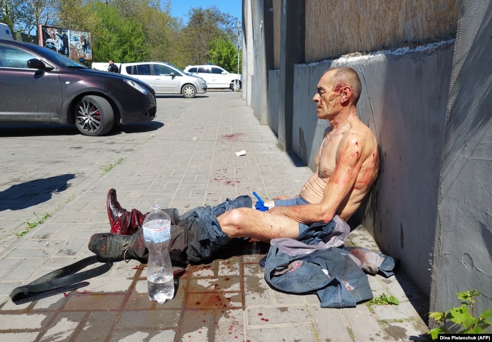 Поранений чоловік сидить біля місцевого супермаркету після російських ударів по Херсону 3 травня 2023 року.