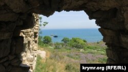 Друга ж вежа Святого Климента, та, що ближча до моря, зруйнована досить сильно, але поки стоїть. І є відмінним фотооб'єктивом. Ось вид з одного з вікон цієї вежі: далеко море, а в ньому півтора року вже сумно лежить суховантаж «Берг», який йшов до Туреччини, але затонув під Феодосією. Його притягли сюди і залишили.