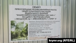 А ось і стара фортеця. Точніше, її остання вежа: вежа Костянтина. Власне, нею старе місто й закінчувалося. Збудована вона була генуезцями в 14 столітті, але раптом у 2017 році вона почала несподівано швидко руйнуватися. Сипалося каміння, відлітаючи з висоти досить далеко, і вежу вирішили реставрувати. Тобто це ми, жителі, вирішили, що її реставрують. Виявилося, що це тільки «протиаварійні роботи»: вежу обшили дошками, щоб не сипалася. З міського бюджету на це виділили 700 тисяч рублів.