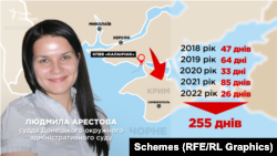 Якщо підрахувати загальну тривалість перебування української судді Арестової у Криму, починаючи з середини 2018 року, то виходить щонайменше 255 днів – сумарно понад пів року на окупованому Росією півострові.