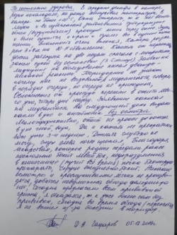 «Ускладнення від застуди також переросли в отит лівого вуха чотири дні тому. Заяву написав в медсанчастину, на наступний день видали вушні краплі і антибіотик без огляду (підкреслено – КР). Малоефективно, отит не пройшов до кінця, у вусі – гній, вода. Та й кашель не припиняється ось уже три тижні», – пише в листі Гафаров.