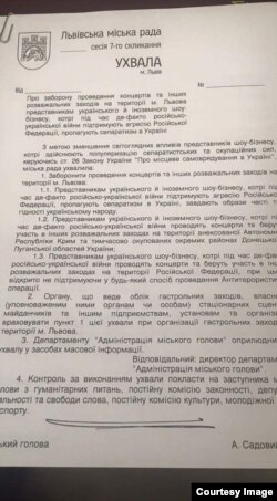 Громадські активісти наполягли на тому, щоб заборонити у Львові виступи українським виконавцям, які концертують у Росії. І редакційна комісія чітко це виписала в ухвалі. Відтак, у Львові заборонено виступати «представникам українського шоу-бізнесу, котрі під час де-факто російсько-української війни проводять концерти та беруть участь у розважальних заходах на території Росії, при цьому відкрито не підтримуючи у будь-який спосіб проведення Антитерористичної операції». Тобто, якщо хтось у час військового конфлікту в Україні побував з концертом у Росії чи буде, то, згідно з рішенням міськради, йому мають заборонити гастролі у Львові. Навіть, якщо це улюблений виконавець львів’ян. З цим положенням погоджувались не всі депутати міськради. А саме представники фракції «Самопоміч» вважали, що українські виконавці, виступаючи у Росії, можуть пропагувати Україну, допомогти росіянам зрозуміти ситуацію на Донбасі. Водночас більшість обранців переконані, що у час проведення АТО неприпустимо заробляти гроші у Росії.