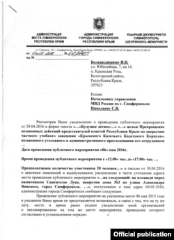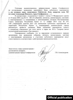 «Назва, цілі та організатор заходу при цьому не називаються. Також у відповіді адміністрації міста Сімферополь запропоновано інше місце проведення пікету «Майбутнє дітям», його запропоновано перенести в парк ім. Ю.А. Гагаріна біля скульптурної композиції «Три грації», – розповів Ілля Большедворов.