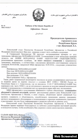 Консульство Афганістану у Росії направило до суду Армянська листа, що підтверджує особу затриманого Мохаммада Кабіра. У відомстві стверджують, що затриманий у Криму Мохаммад Кабір не має ніякого стосунку до розшукуваної Інтерполом людини.