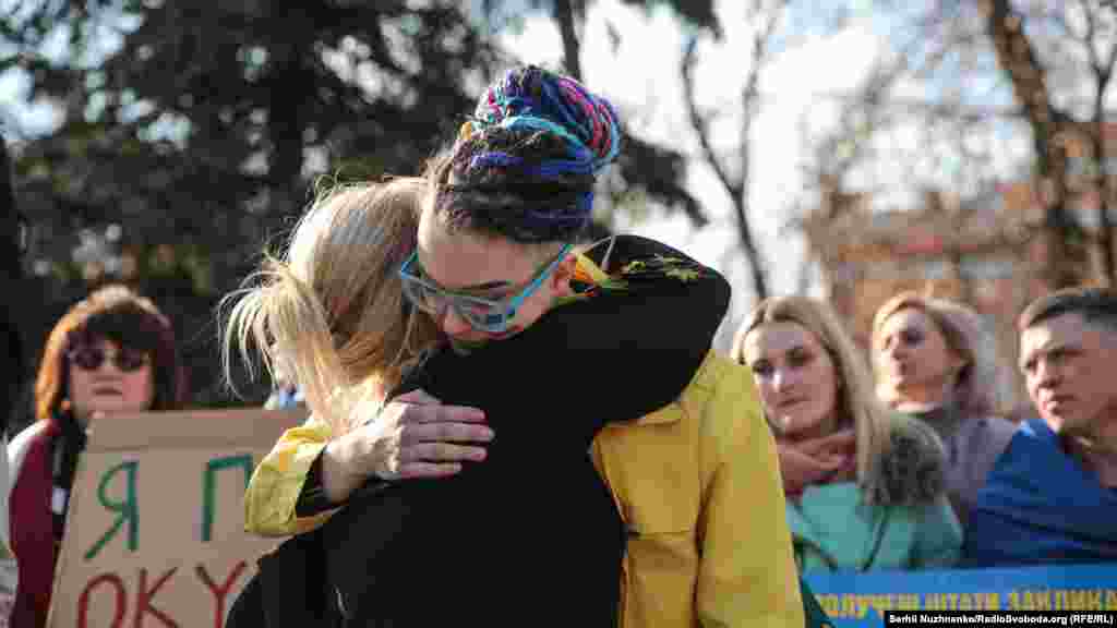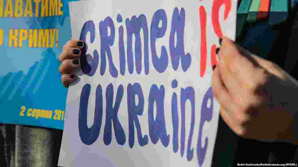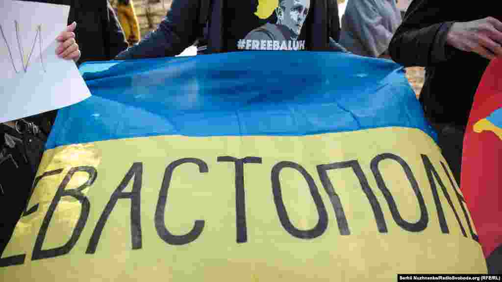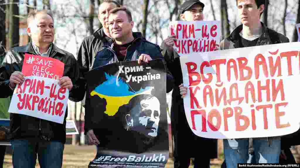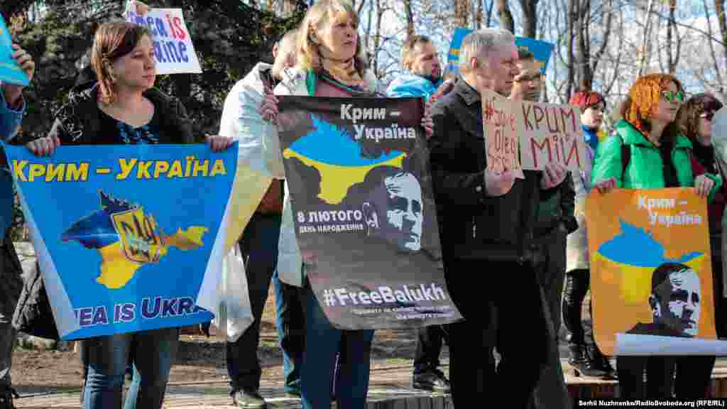 Багато хто прийшов у футболках на підтримку засудженого в Криму українського активіста Володимира Балуха, якого етапували в колонію сусідньої Росії.