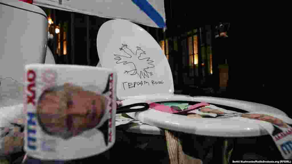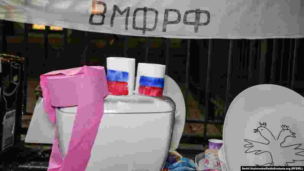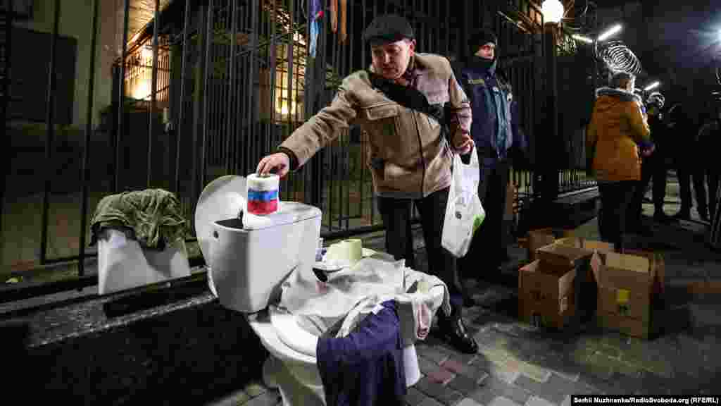 У Києві під будівлею посольства Росії пройшла акція «Перший український гумконвой для Росії». Десятки киян принесли під російське відомство унітази, туалетний папір, спідню білизну, щоб «матеріально допомогти росіянам». Також активісти зобразили «прапор» Військово-морських сил Росії і медаль «За взяття унітазу».