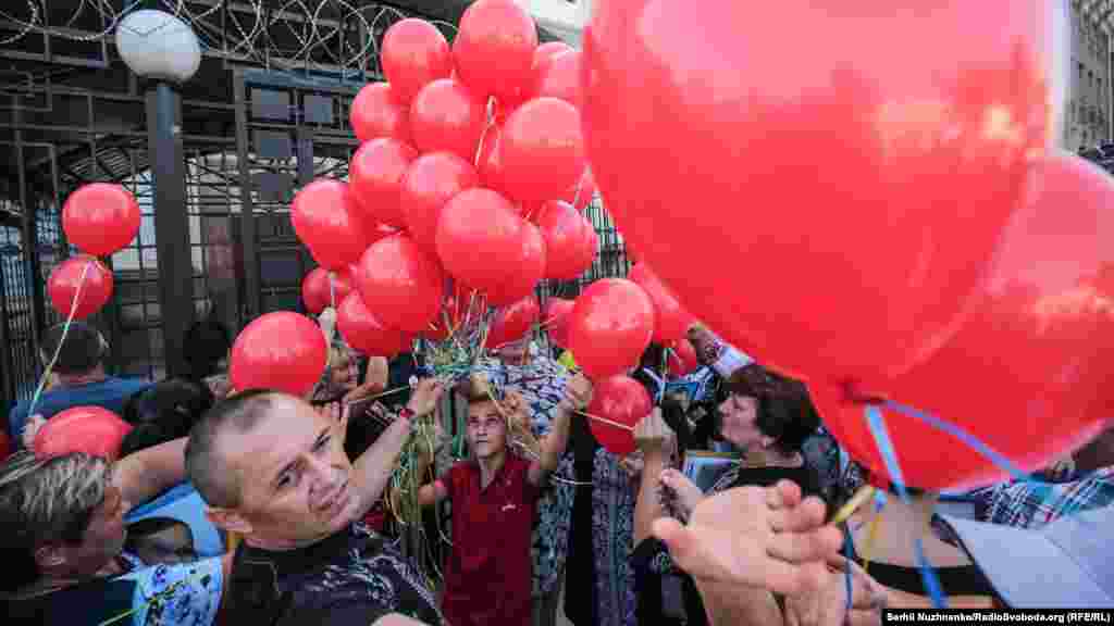 Матері цих військовослужбовців прив’язали до огорожі російської амбасади червоні кульки, які символізують кров.