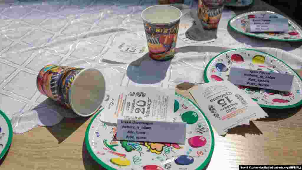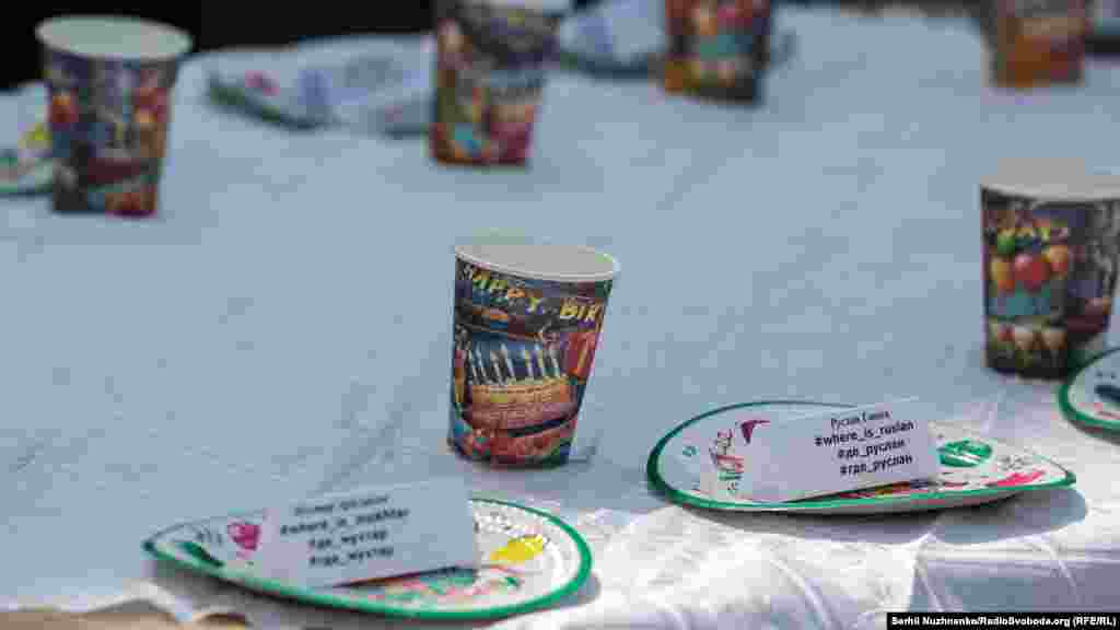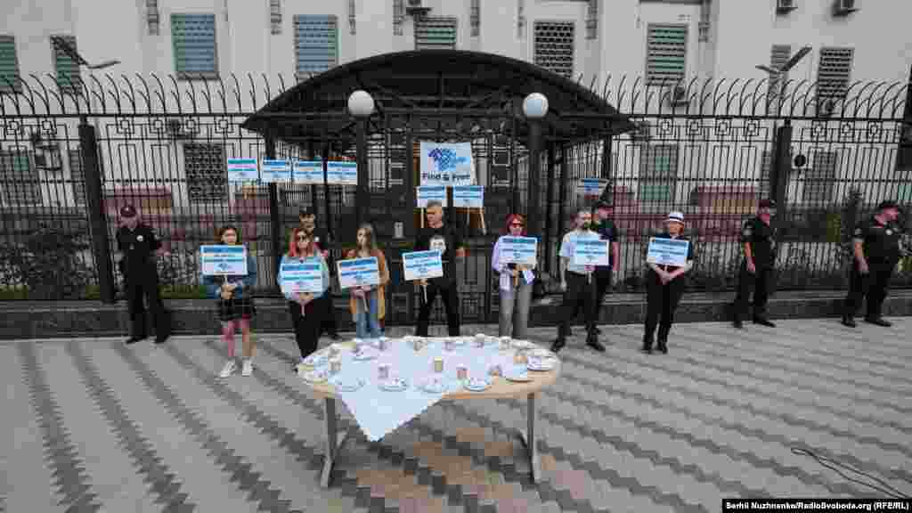 Під парканом посольства активісти накрили стіл, на якому був посуд із іменами зниклих безвісти, активісти також тримали в руках іменні таблички.