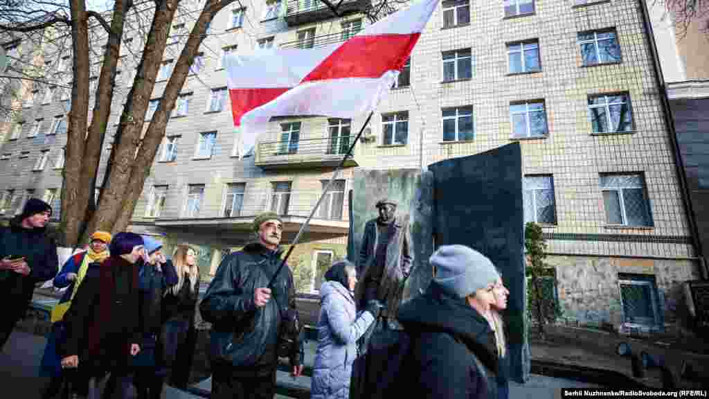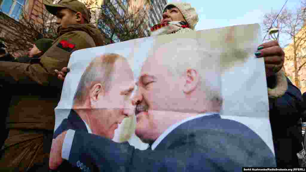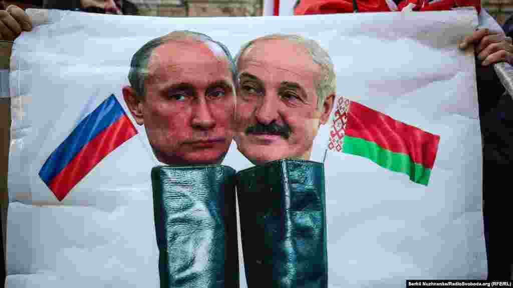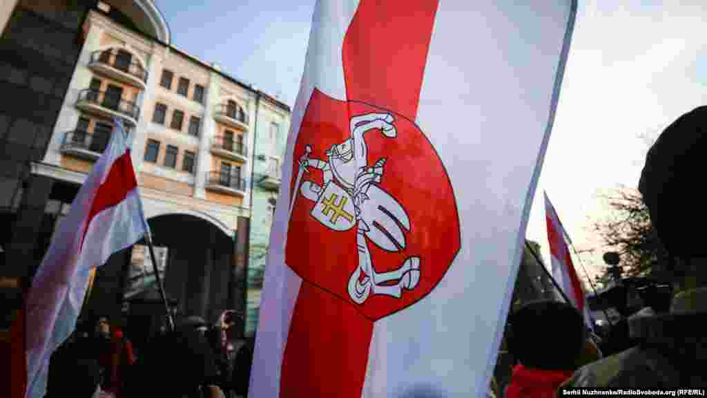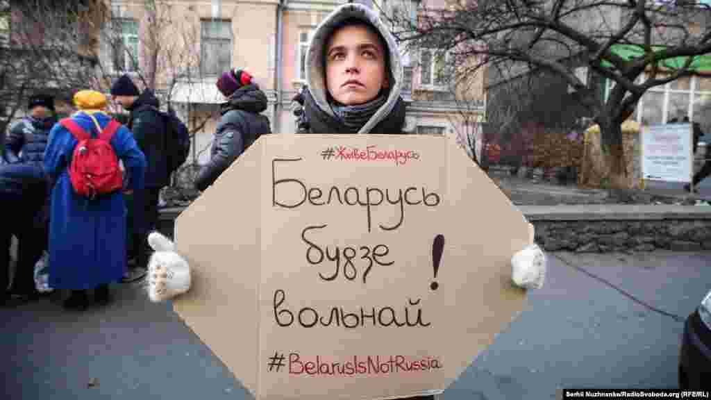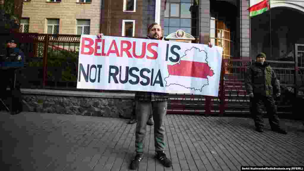 У Києві завершилась акція «Belarus is not Russia» на підтримку білоруського народу проти інтеграції з Росією, повідомляє кореспондент Радіо Свобода. Кілька десятків активістів з білоруськими прапорами зібралися на Майдані Незалежності. Звідти вони пройшли маршем до посольства Білорусі.