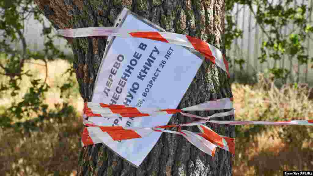 Фісташка, якій 26 років, розташована за територією будівництва. Дерево на всякий випадок обмотали стрічкою і повісили саморобні таблички, які інформують, що воно занесене в три Червоні книги