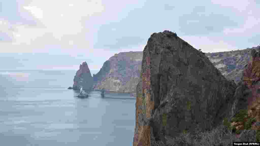 Вдалині красується мис Фіолент, а поруч із ним розташовані знамениті скелі Орест і Пілад, які в народі називають Зуб і Вітрильник – за їхню форму. Максимальна висота мису Фіолент – приблизно 150 метрів. За переказами, саме на цьому мисі ступив на кримську землю апостол Андрій Первозванний, який прибув сюди для проповіді Євангелія.