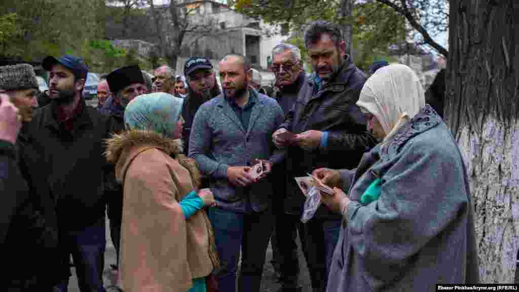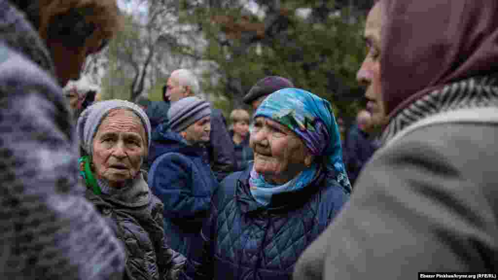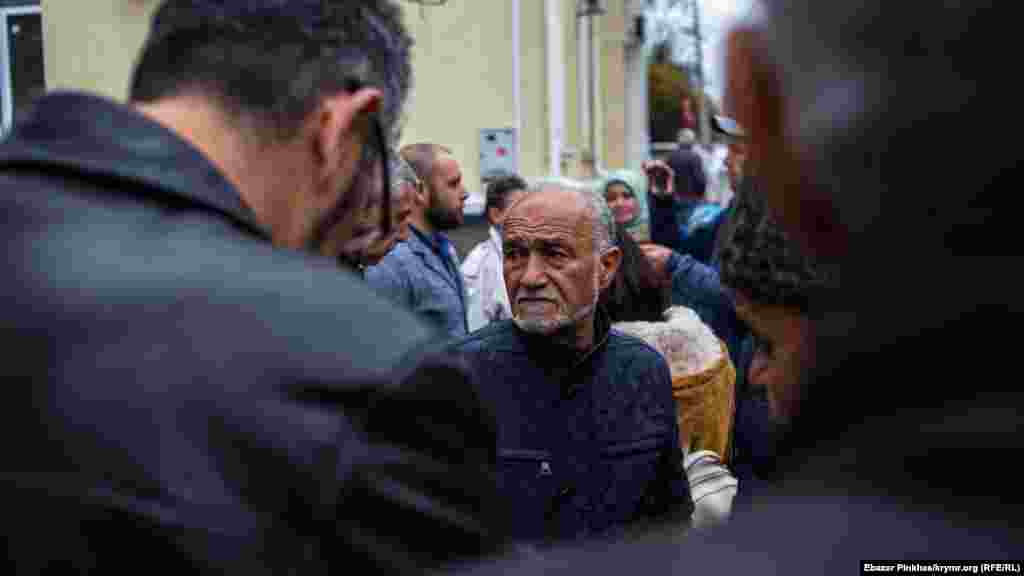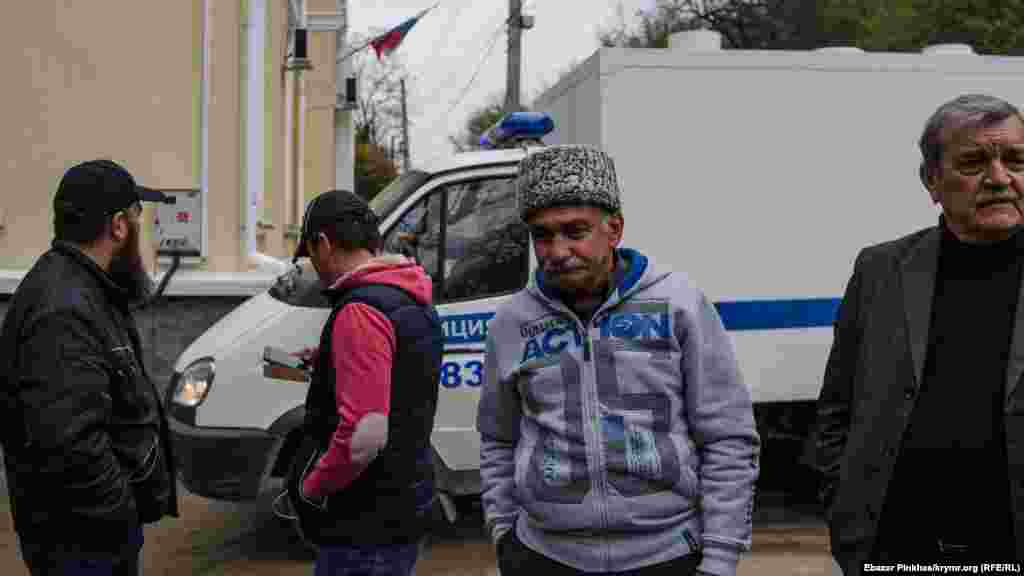 Аліє Дегерменджі розповідає присутнім про подробиці засідання, а співробітники російської поліції здалеку спостерігають за присутніми