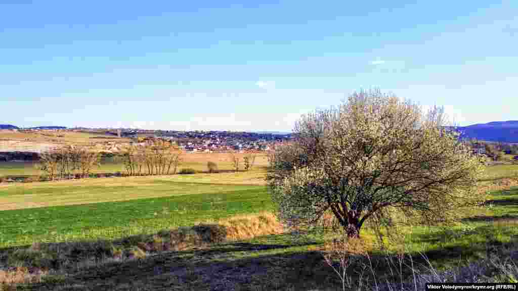 Самотня корова пасеться на великій галявині. Звідси відкриваються види на Сімферополь