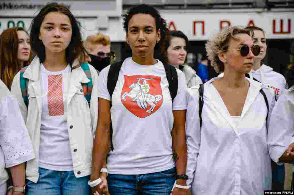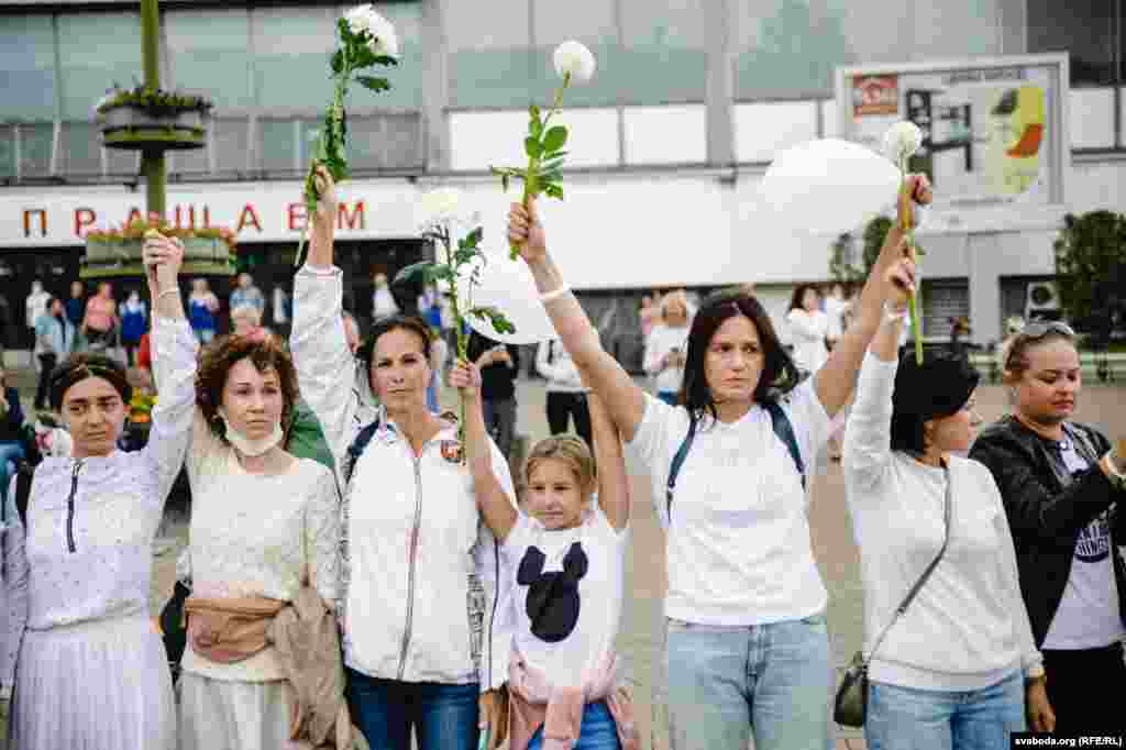 У Мінську кілька сотень жінок у білому одязі і з квітами в руках вишикувалися в ланцюг на знак солідарності проти насильства під час протестів у Білорусі, повідомляє Радіо Свобода.