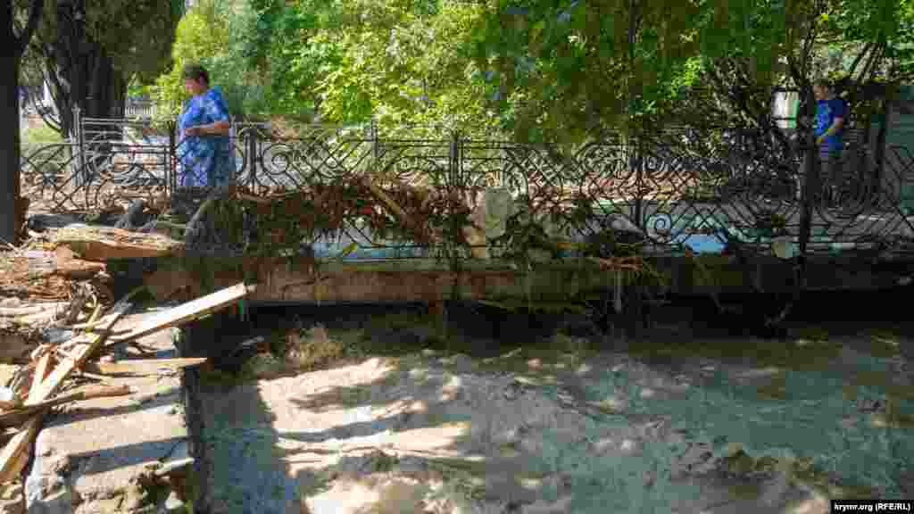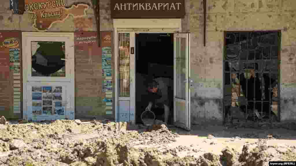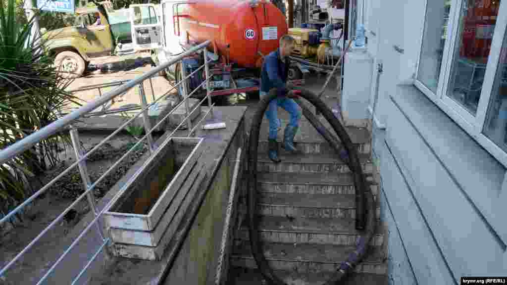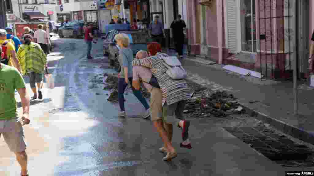 Жителі курортної столиці Криму продовжують усувати наслідки небувалої повені. Десь воду викачують помпами, а десь – вичерпують вручну.