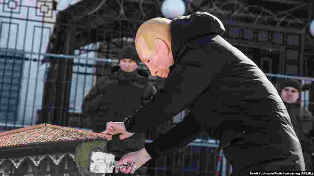 Активісти в масках президента Росії Володимира Путіна і глави підконтрольного Кремлю уряду Криму Сергія Аксенова (Аксьонова) «штукатурили» макет Ханського палацу