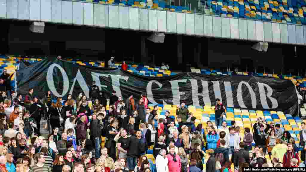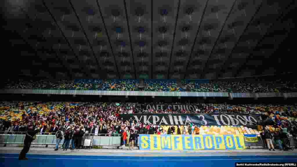 Активісти зайняли центральні трибуни стадіону та розмістили банер «Олег Сенцов. Україна з тобою!». Після цього на стадіоні погасло світло, й активісти підсвітили банер фаєрами, вигукуючи «Свободу Олегу Сенцову», «Крим – це Україна».
