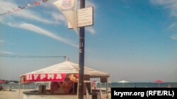 На інформаційному табло пляжу поруч із точкою продажу шаурми зазначені номери телефонів «екстрених служб» і «гарячих ліній» Мінкурортів Криму, а також влади району. Щоправда, розміщені вони на висоті не менше трьох метрів від землі й половину тексту на них закривають прапорці з символікою міста.