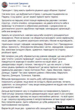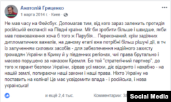 «Не мав часу на Фейсбук. Допомагав тим, від кого зараз залежить протидія російській експансії на Півдні країни. Міг би зробити більше і швидше, якби мав повноваження хоча б того ж Парубія…» – написав Анатолій Гриценко.