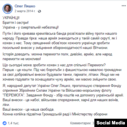 Лідер Радикальної партії 1 і 2 березня 2014 року у соціальних мережах писав про все: починаючи від того, як допомогти фінансово армії, і завершуючи тим, що Ющенко винен разом із Януковичем.