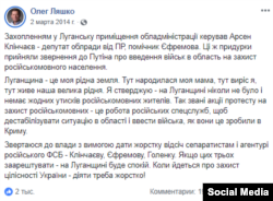 «Захопленням у Луганську приміщення обладміністрації керував Арсен Клінчаєв – депутат облради від Партії регіонів, помічник Єфремова. Ці ж придурки прийняли звернення до Путіна про введення військ в область на захист російськомовного населення… Звертаюся до влади з вимогою дати жорстку відсіч сепаратистам і агентурі російського ФСБ – Клінчаєву, Єфремову, Голенку. Якщо цих трьох заарештувати – на Луганщині буде спокій. Коли йдеться про захист цілісності України – діяти треба жорстко!»