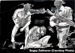 Сергій Захаров провів в ув’язненні в сепаратистів півтора місяця. І на малюнках, які лягли в основу оповіді, розповідається про те, що він пережив. Нескінченні побиття, тортури, коли задихаєшся від нестачі повітря в непристосованому для утримання полонених тісному приміщенні, імітації розстрілів.