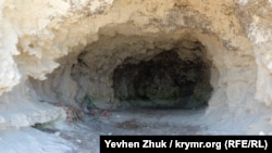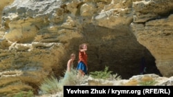 А ось залишки древніх стін, не так давно розкопаних археологами ‒ з 1990 року на Виноградному проводяться дослідження, знайдено кілька храмів, деякі наземні. Поблизу безліч печер ‒ частина розкопаного десять років тому монастирського комплексу, вчені припускають, що в них могли також бути храми або чернечі келії. Ченці вирощували тут виноград. Звідси й назва мису ‒ Виноградний. Вгорі на скелі в більш пізній період була багата садиба, кольорова кераміка й зараз зустрічається на схилах. Майже в усіх печерах влітку живуть люди. Чомусь мені зустрічаються переважно дівчата.
