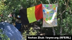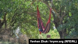 Прив'язаний до дерев гамак, мангал, намети в кущах, бельгійський прапор, а також розмальований повітряними кульками та фігурками сови шматок білої ганчірки. Чи може це жіноча хустка? Просуваюсь далі. Цикади скрекочуть так, що у вухах дзвенить, але побачити та сфотографувати жодну не виходить. Навколо багато фісташкових дерев.
