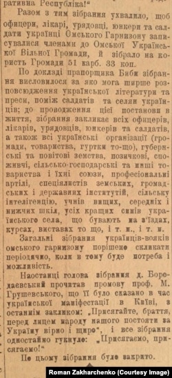 – Український рух намагався пристосовуватися до цих умов. Ще до Жовтневого перевороту були проведені перші зібрання українських громад в Омську, Томську, Новомиколаївську (зараз Новосибірськ – ред.), Барнаулі, в Славгороді, де були оформлені або місцеві українські ради, або українські громади, або товариства. Значу роль у їхньому оформленні відіграли мобілізовані українці, які потрапили до сибірських маршових рот, до сибірських стрілецьких полків.