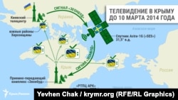 У 2014 році телевізійне мовлення в Криму було аналоговим і цифровим ‒ у форматі Т2. З передавального центру в Києві українські телеканали піднімалися на європейський супутник Astra-1G (31,5° в.д.), а наземне обладнання приймало цей сигнал, після чого він лунав через мережу ефірних передавачів у цифровому форматі Т2, і, врешті-решт, опинявся на телеекрані кримчан.