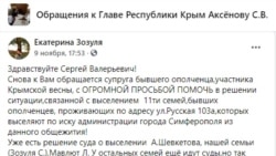 Про майбутнє виселення з гуртожитку російському главі Криму Сергію Аксенову скаржиться дружина колишнього ополченця, учасника «кримської весни» Катерина Зозуля. Вона просить його «допомогти у вирішенні ситуації».