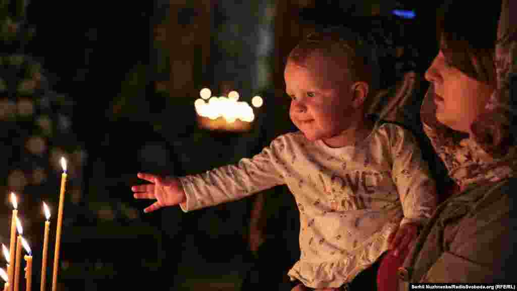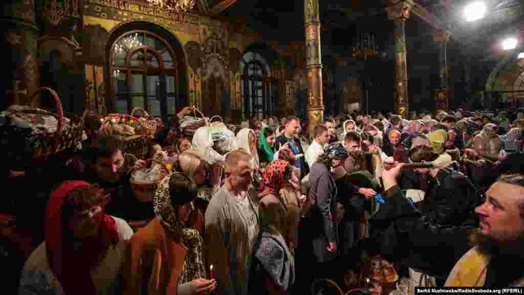28 квітня в Україні відзначають свято Воскресіння Христового. Напередодні привезли «благодатний» вогонь із Єрусалима до Києва. На території усієї України пройшли вечірні церковні служби. Фотокореспондент Радіо Свобода разом із вірянами побував у Свято-Михайлівському Золотоверхому соборі (Православна церква України), Києво-Печерській лаврі (Російська православна церква в Україні (УПЦ МП) та у Володимирському соборі, де відбулися урочисті богослужіння, присвячені Великодню.
