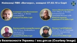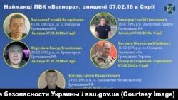Служба безпеки України опублікувала днями особисті дані ще дев'яти осіб, які, за її інформацією, воювали в Сирії в складі ПВК «Вагнера» і загинули 7 лютого в бою під містом Дейр-ез-Зор при спробі наступу на позиції «сирійських демократичних сил» і американських військових радників, які їм допомагали. Раніше, 26 липня, СБУ на спеціальному брифінгу оприлюднила дані про 41 загиблого в цьому зіткненні. Загалом, як стверджують представники української спецслужби, того дня під Дейр-ез-Зором загинули понад 80 найманців із Росії та інших країн.