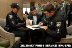 До речі, біля дільниці, де голосував Зеленський, дівчина, яка представилась учасницею Femen, влаштувала акцію і з оголеними грудьми, на яких було написано «pig in a poke» – сталий англійський вислів, аналогічний українському «кіт у мішку».