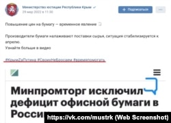 Міністерство юстиції російського уряду Криму також публічно демонструє підтримку політики Путіна щодо України. Відомство повідомляє про це чи не в кожній своїй публікації у соцмережах.