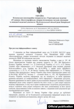 У відповідь на інформаційний запит, яке отримало Радіо Свобода від КНП «ТМО «Багатопрофiльна лiкарня iнтенсивних методiв лiкування та швидкоi медичноi допомоги» у Мелітополі за підписом тієї ж Лариси Саприкіної зауважили, що інформацію про лікування Ніни Сторожук можуть отримати лише родичі померлої.