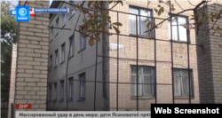 За їхньою версією, в територію школи було влучення мін 120-го калібру. Діти спускались у бомбосховище. Вікна корпусу були продірявлені та подекуди вибиті (показано 3-4 таких точки). Директорка інтернату показує на долоні три артилерійські осколки. Спікер угруповання «ДНР» Едуард Басурін демонструє на камери запал міни, яку нібито підібрав на подвір'ї школи: він стоїть перед корпусом інтернету та вказує, що міна влучила «з протилежного боку». Підконтрольні Росії адміністрації сказали, що так Україна вчинила до Міжнародного дня миру.